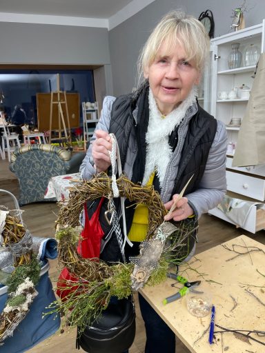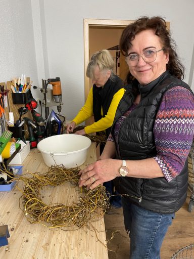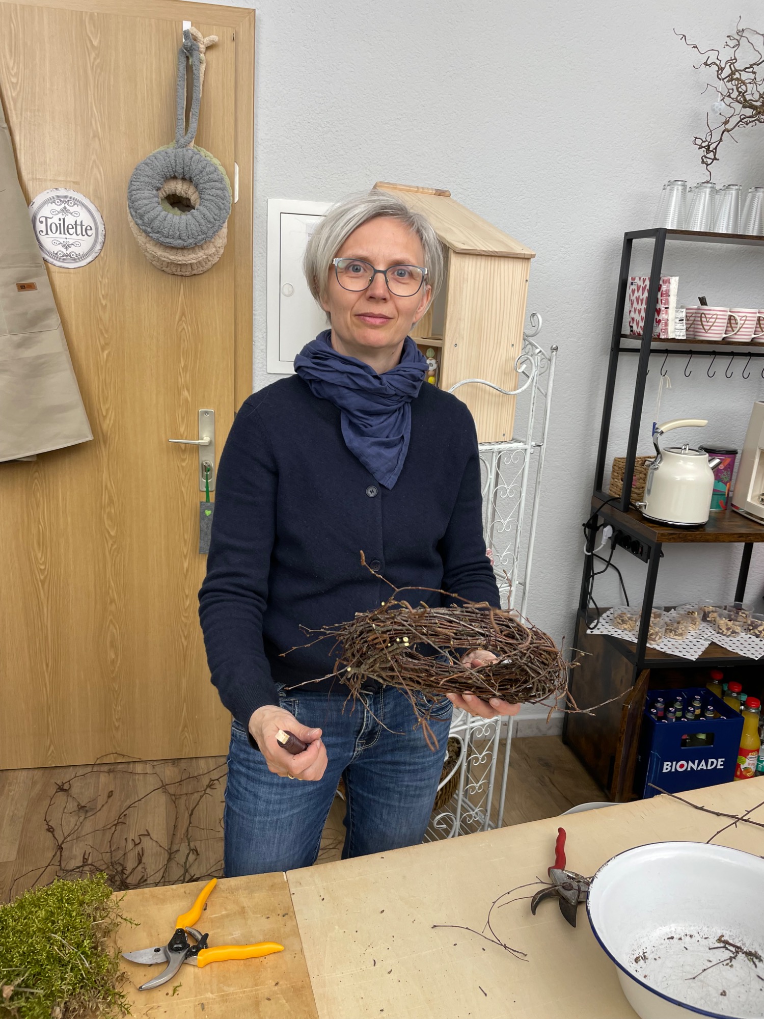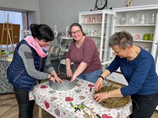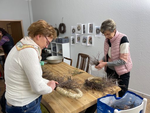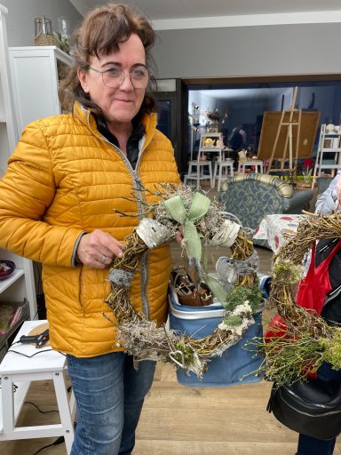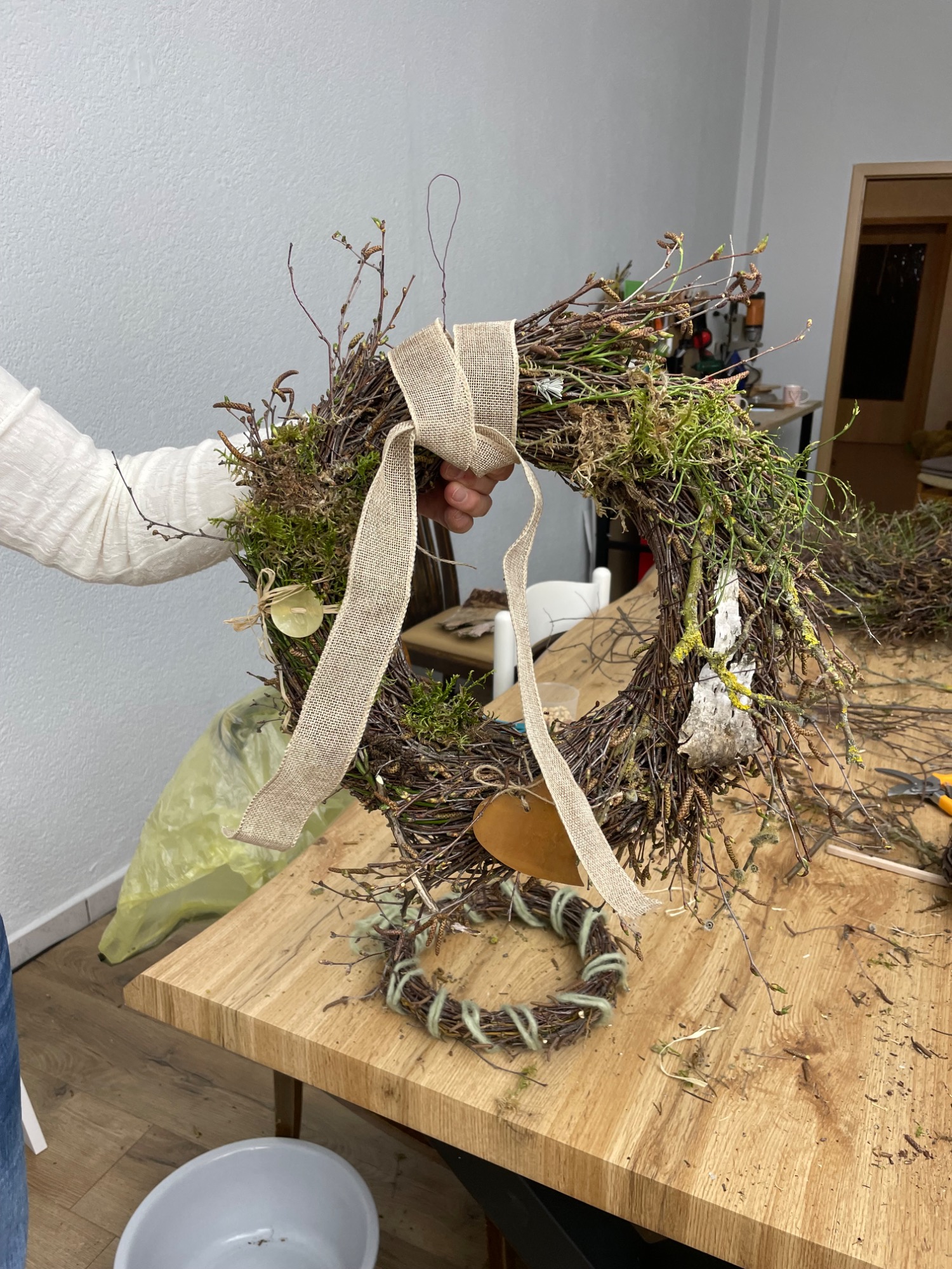Das war unser erster Workshop dieses Jahr. Jede Teilnehmerin konnte sich aus einem Fundus an Naturmaterial und kleiner Deko bedienen und ganz individuell gestalten. Manchmal braucht man vier Hände, um den Kranz in Form zu bringen oder einfach einen Tipp, wie man etwas hinbekommt. Das geht dann im Workshop leichter als zu Hause allein.